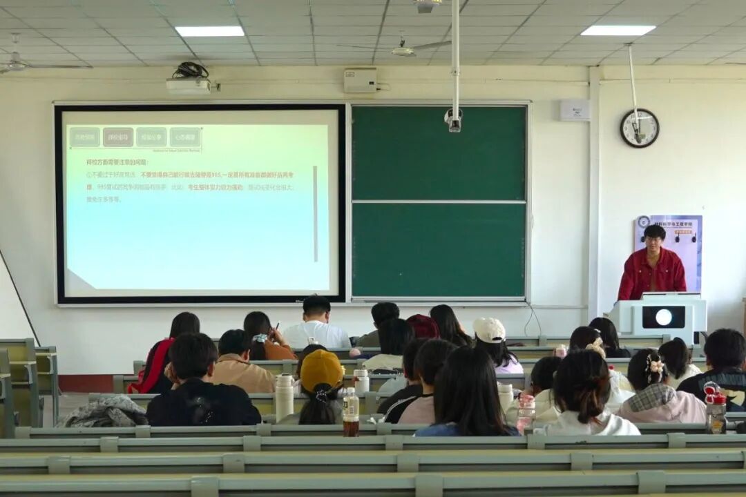 张毅同学则结合自身考研经历,以案例分析形式科学讲解目标院校选择的方法。他建议同学们综合考量院校学科实力、地域优势及个人发展规划,避免盲目跟风。在专业课备考方面,他分享了“真题导向+应用总结”的双轨策略,并现场演示了如何高效整理核心考点与高频题型,为同学们提供了可借鉴的实操方案;对于政治备考,他指出:政治大题要选择性背诵,紧扣时政要点与主题特征词进行融会贯通,确保答题时抓住“关键点”。