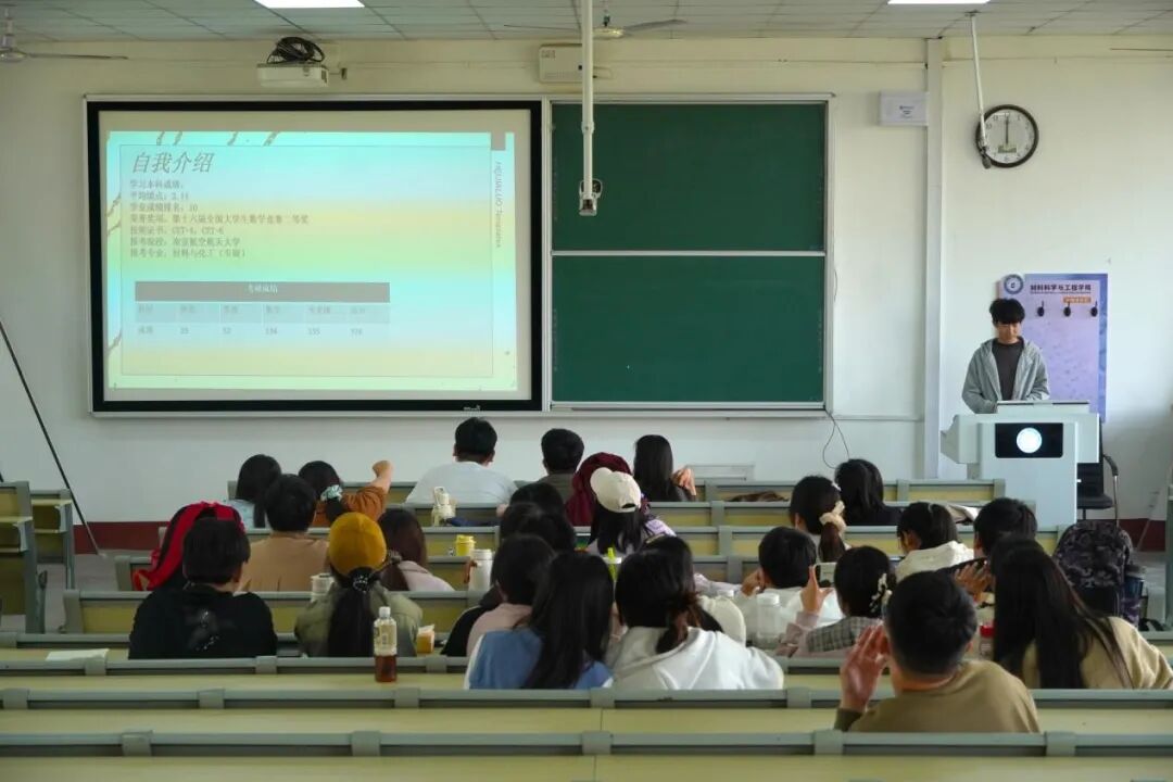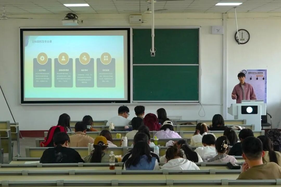 交流会上,王士方同学以“态势预测”为切入点,结合近年考研数据与政策动态,深入剖析了当前考研竞争环境。他通过详实的数据对比,解读了报考人数变化、院校招生政策调整等趋势,并针对材料科学与工程专业的特殊性,提出“精准查找,动态调整”的择校方针。此外,他还分享了备考期间的时间管理技巧与心态调节方法,强调“长期规划与短期目标相结合”的重要性。针对专业课,他提出“框架构建+专题突破”的学习模式,鼓励大家把备战初试集成化、体系化。