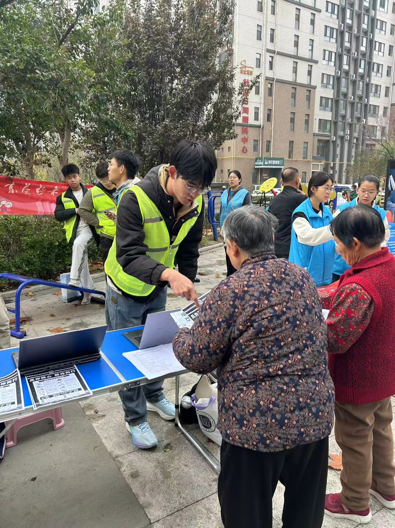 活动现场,志愿者们提前布置好宣传场地,横挂醒目的反诈主题悬浮横幅,设立专门的反诈咨询台,迅速吸引了过往居民的关注。针对老年人等易受骗群体,志愿者们主动上前发放反诈宣传单和防骗手册,用通俗易懂的语言讲解电信网络诈骗、金融诈骗等新型诈骗的常见手段,包括虚假投资理财、冒充客服退款、冒充亲属借钱等高发骗局。