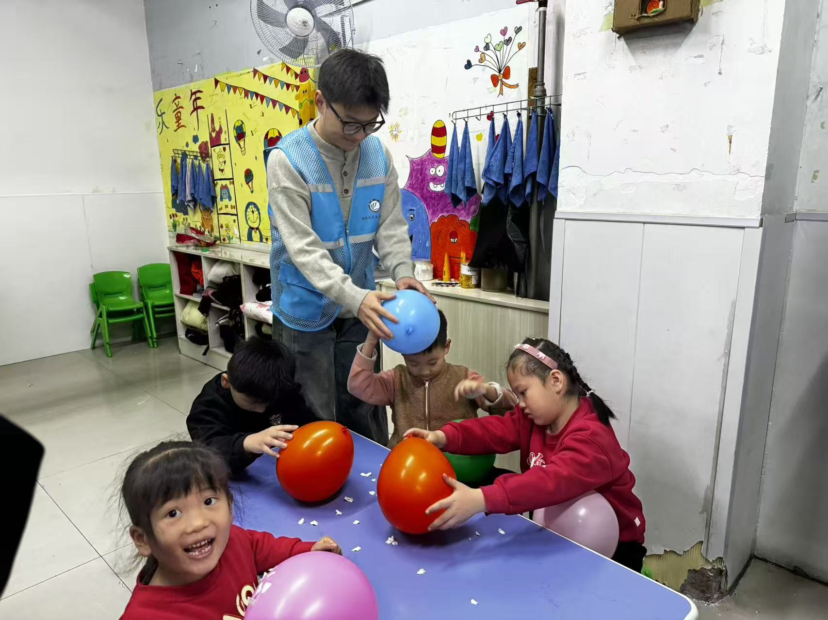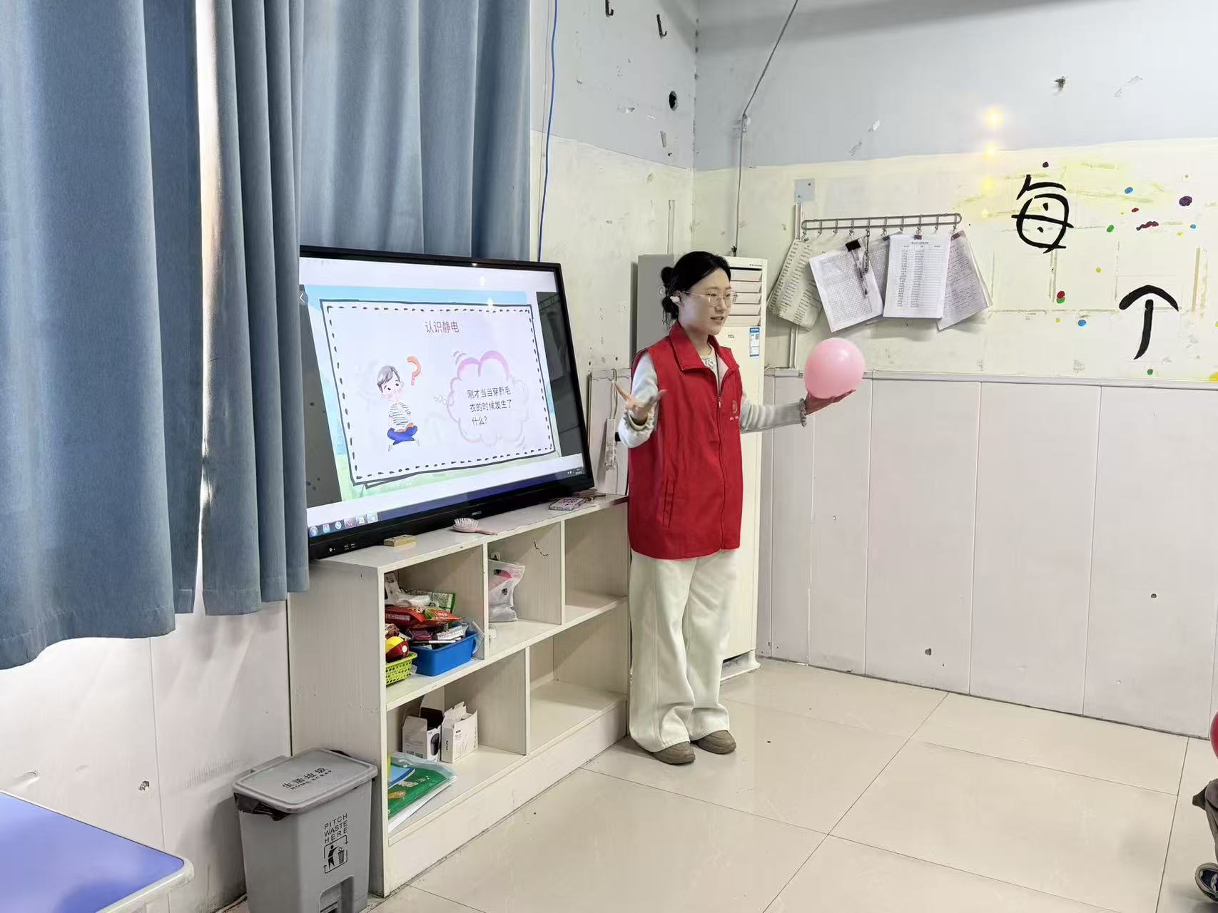 活动伊始,志愿者们以"会吸东西的魔法气球"为题开启科普之旅。面对孩子们好奇的目光,志愿者们用生动通俗的语言解释静电原理,将抽象的科学概念转化为"毛衣上的噼啪声""门把手的小刺痛"等生活场景,瞬间拉近了科学与孩子们的距离。实验环节中,志愿者们为每组小朋友分发彩色气球、毛绒布和碎纸片,耐心指导大家将气球在头发或布料上反复摩擦,再缓缓靠近碎纸片。