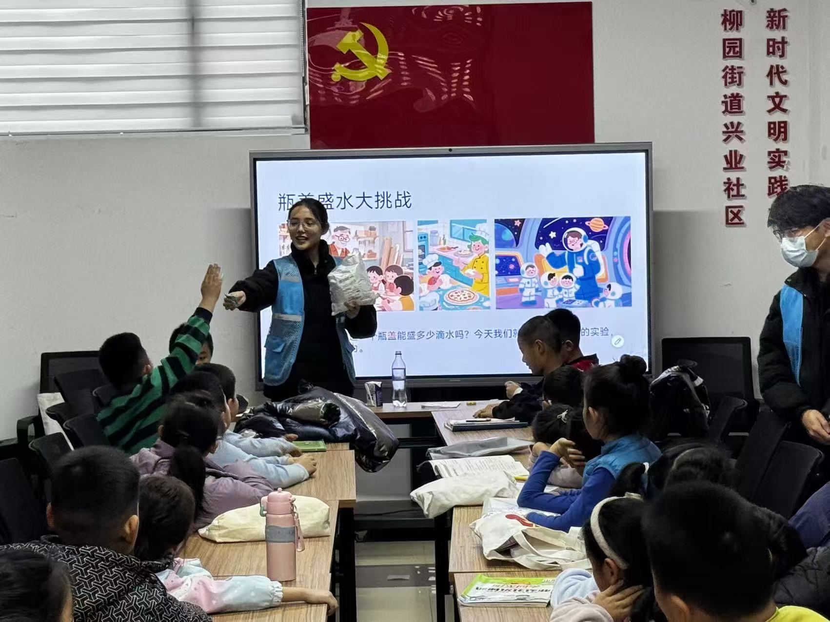 志愿者们为社区孩子提供一对一作业辅导,细致解答问题,帮助他们梳理思路、巩固知识。随后进行的趣味实验环节,通过“表面张力”“丁达尔效应”和“静电吸附”等简单实验,生动展示科学原理,激发孩子们的好奇心与探索欲。活动中,志愿者还准备了盲盒福袋作为互动鼓励,让孩子们在收获知识的同时感受快乐。