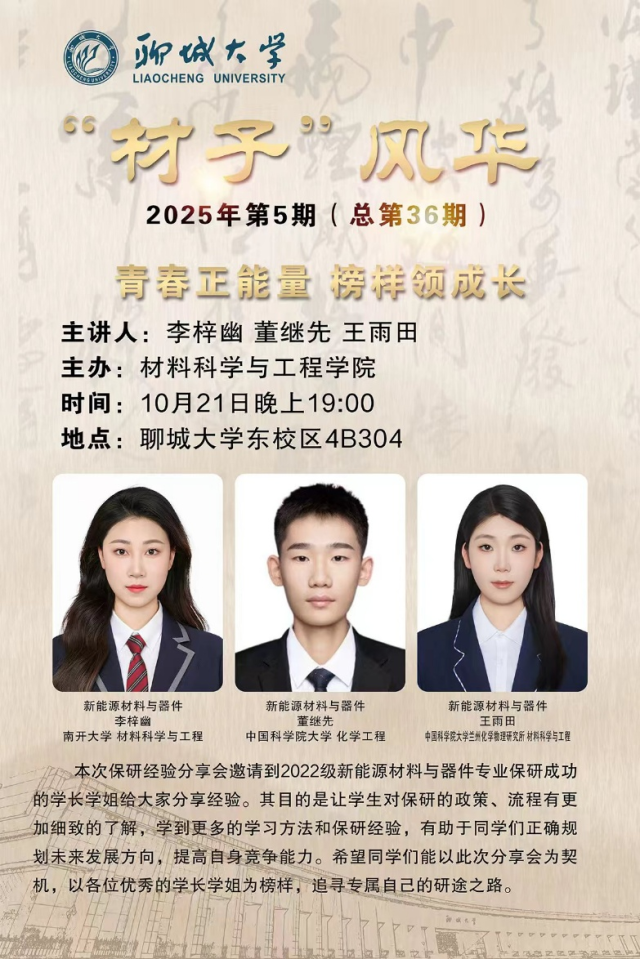 为帮助学院学子把握保研政策,做好学业规划,2025年10月21日,70net永乐高于东校区4#B304教室举办“材子”风华 — 新能源材料与器件专业保研经验交流会,邀请2022级优秀保研学子李梓幽、董继先、王雨田担任主讲嘉宾。