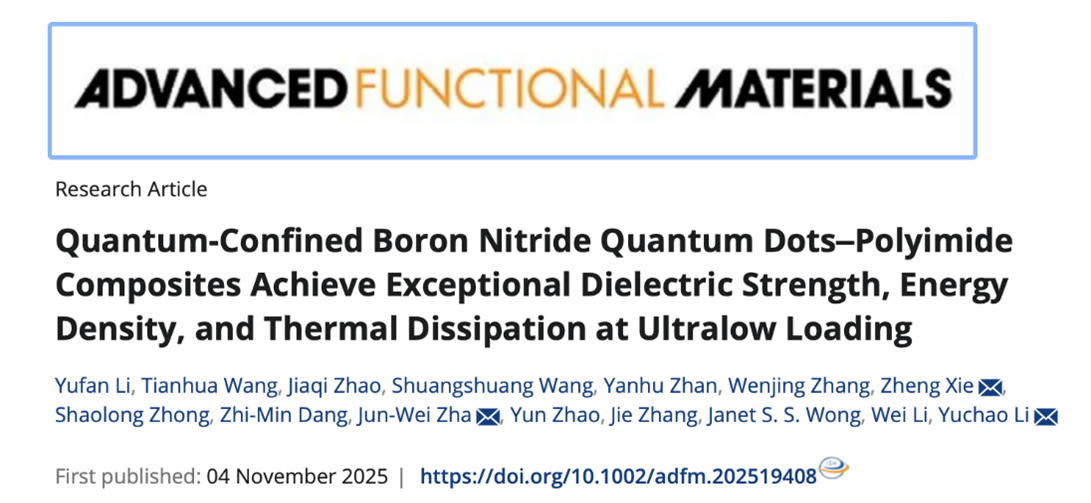 近日,70net永乐高李玉超教授团队联合济南大学谢政教授、华北电力大学查俊伟教授,在兼顾耐高温导热储能电介质材料方面取得新的进展。相关成果以“Quantum-confined boron nitride quantum dots-polyimide composites achieve exceptional dielectric strength, energy density, and thermal dissipation at ultralow loading”为题,发表在国际顶级期刊《Advanced Functional Materials》(一区TOP期刊,IF="19.0)上。论文第一作者为硕士研究生李雨凡同学,通讯作者为李玉超教授,70net永乐高为第一署名单位。